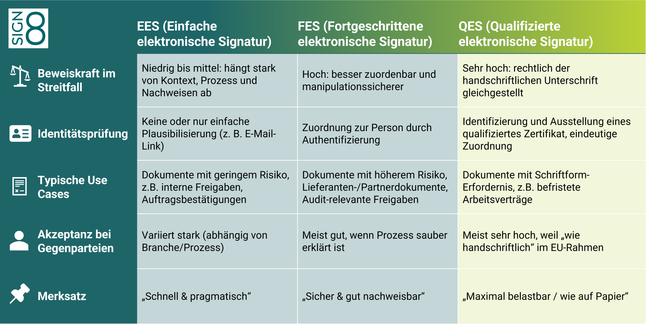 eIDAS unterscheidet drei Niveaus: EES, FES und QES. Sie unterscheiden sich vor allem in Identitätsbezug, Nachweisbarkeit und Aufwand.