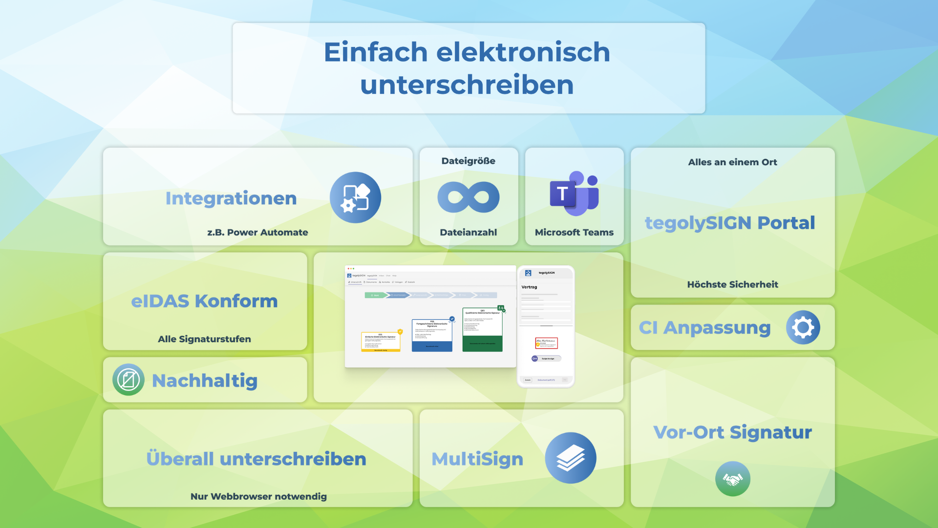 Die tegoly GmbH ist ein innovativer Anbieter digitaler Signaturlösungen, die Unternehmen dabei unterstützen, Verträge und Dokumente rechtssicher und effizient zu unterzeichnen. Unsere Lösung, die sich nahtlos in Microsoft Teams – aber auch in DATEV und Power Automate integrieren lässt –, stellt eine intuitive Bedienung in den Mittelpunkt.